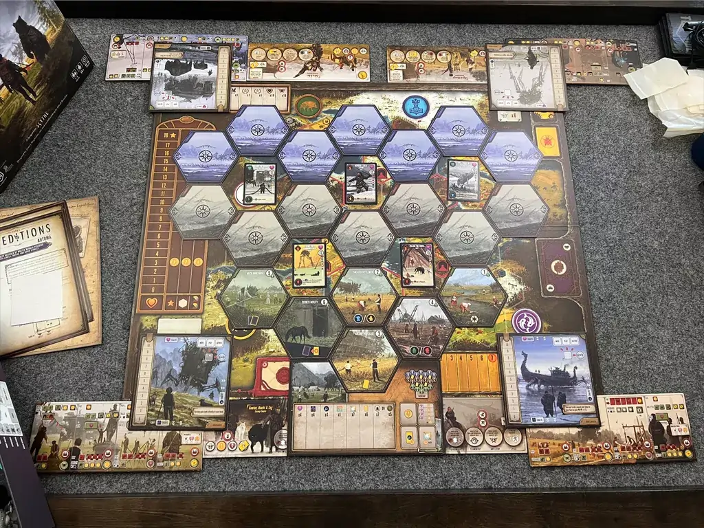 Enquanto Expeditions impressiona com produção de qualidade, miniaturas imponentes e arte belíssima, muitos jogadores relatam que a sensação de “descoberta” termina cedo demais. O tabuleiro modular, que inicialmente oferece um ar de exploração, logo se revela pequeno e limitado — especialmente em partidas com quatro ou cinco jogadores, onde a exploração se esgota rapidamente, dando lugar a uma rotina repetitiva de coleta e reciclagem de cartas.