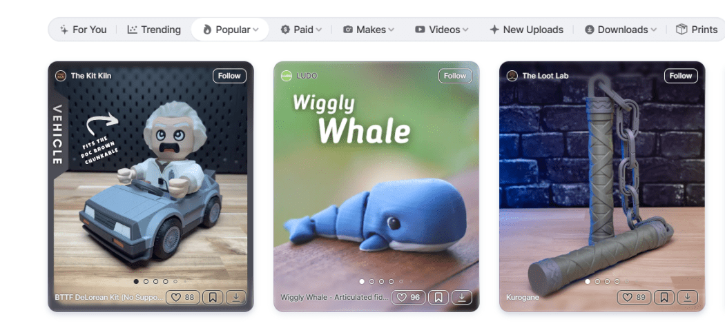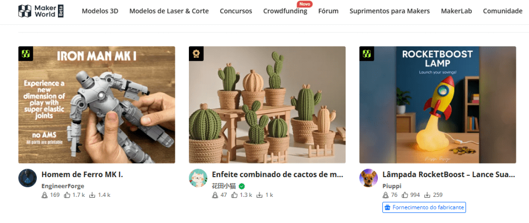 Organizado e com recursos de comunidade, o Creality Cloud traz ranking de downloads, coleções e interação entre criadores, o que é ótimo para trocar ideias.