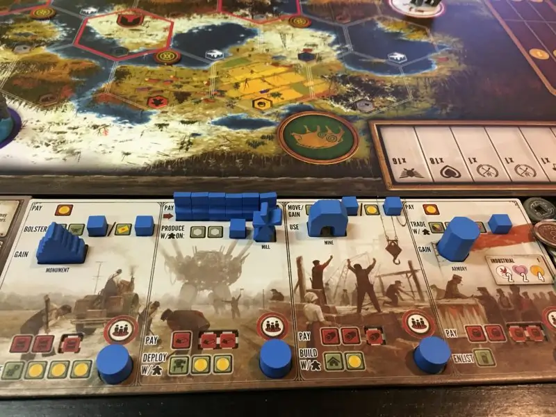 - Em cada turno, você escolhe uma das seções do seu tabuleiro de ações para coletar recursos, construir, recrutar, mover unidades ou atacar.